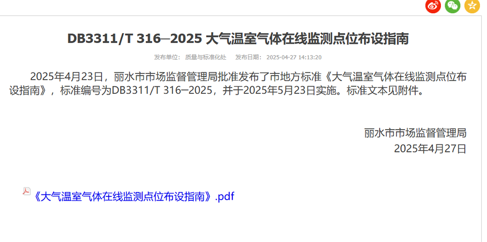 2025年5月23日,由省环保集团牵头起草的地方标准《大气温室气体在线监测点位布设指南》(标准编号:DB3311/T 316─2025)正式实施。